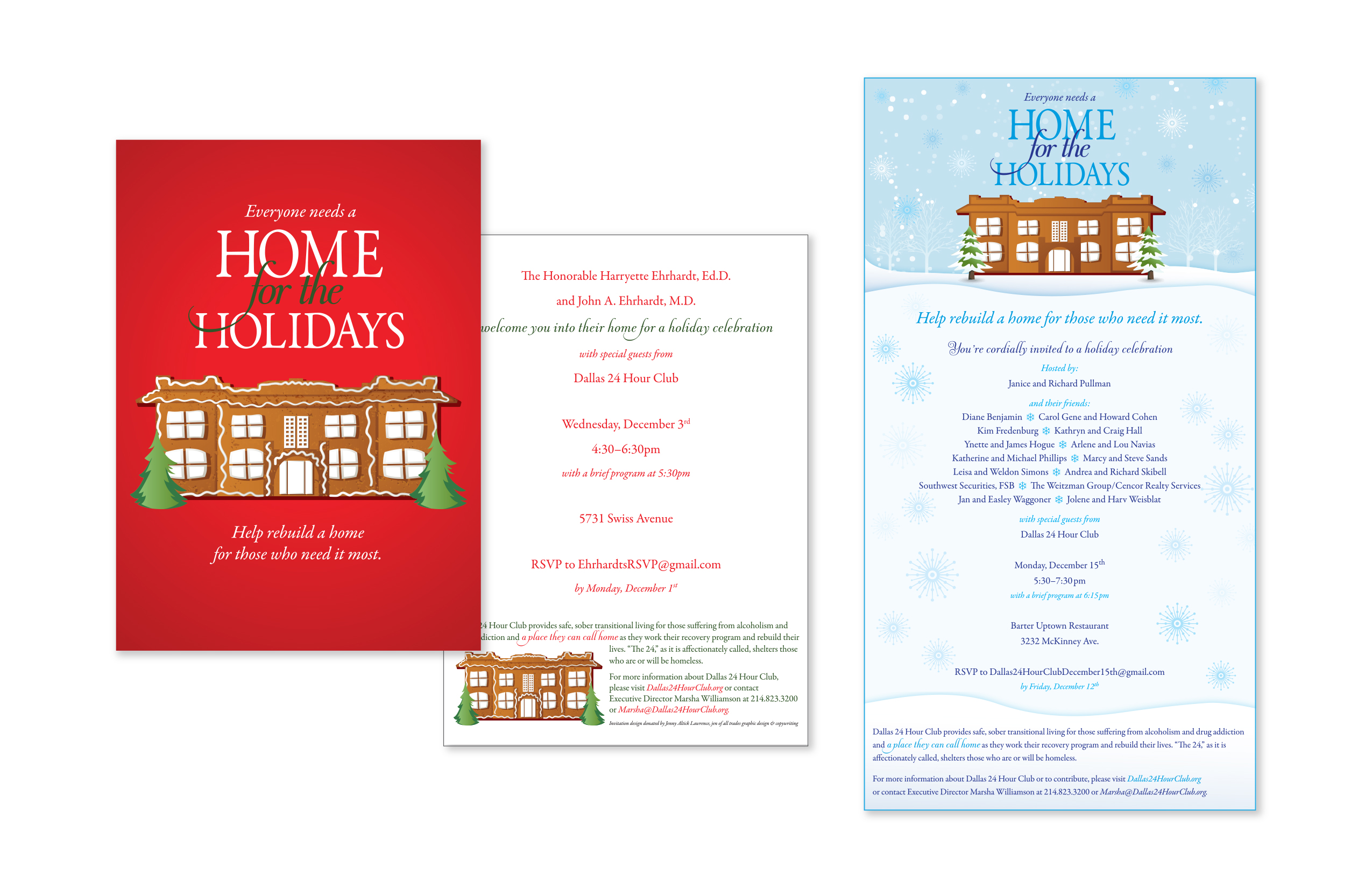 Create holiday event invitation to entice potential donors to attend party to raise awareness for organization that provides a home to homeless, recovering addicts.