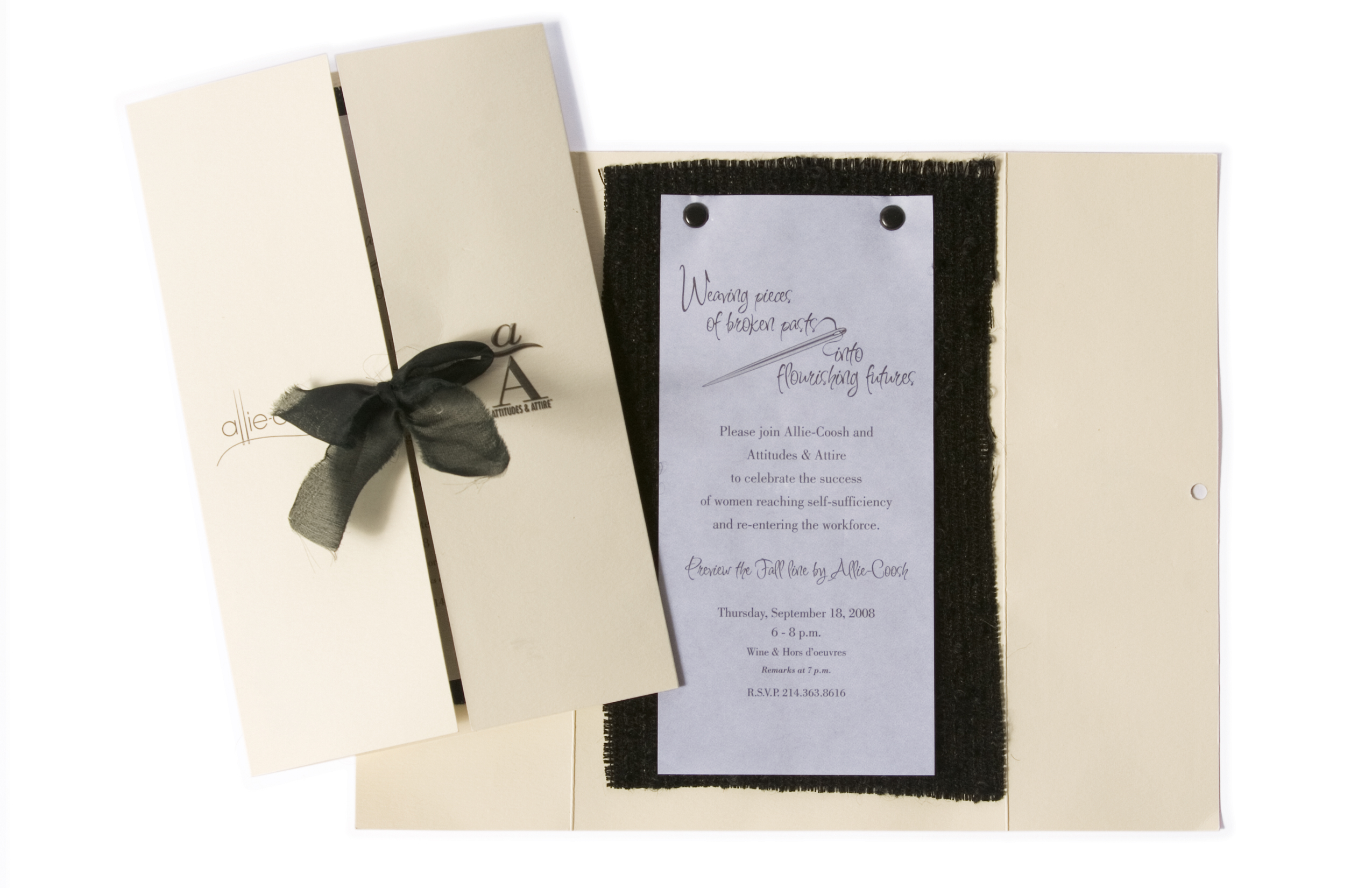 Utilized linen paper, organza ribbon & woven fabric to tie together clothing boutique & clothing aspect of Attitudes & Attire. Assembled by hand.