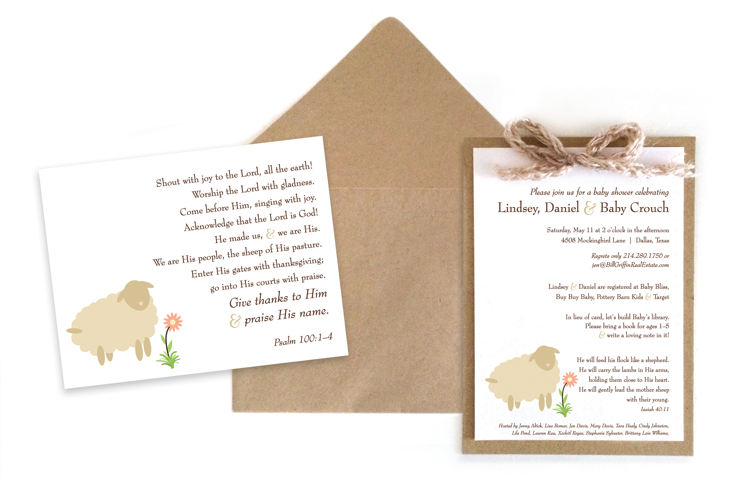 Utilized yarn & Kraft paper to emphasize rustic “Little Lamb” theme. Assembled by hand.