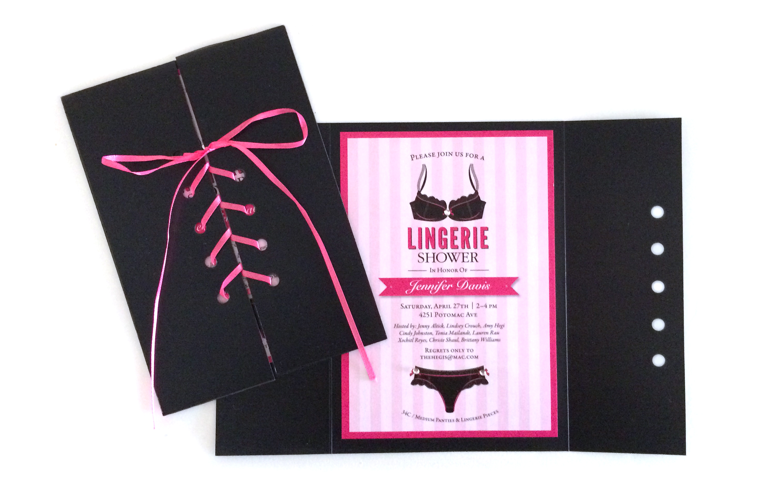 Utilized satin finish paper, satin ribbon lace-up corset effect with gate-fold & rhinestone embellishments on lingerie illustrations to emphasize lingerie theme. Assembled by hand.